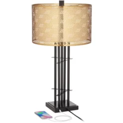 Possini Euro Design Deborah Modern Mid Century Table Lamp 30″ Tall Black With USB Charging Port Gold Metal Double Drum Shades For Living Room Desk